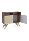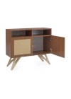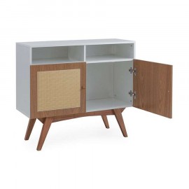 Fabricado em MDF BP 15mm revestido com melamina de alta resistência. Pés e detalhes em madeira maciça (jatobá ou taeda) com acabamento em stain não verniz. Porta com aplicação de rattan natural. Entregue desmontado e embalado em caixa de papelão. Peso: 23kg. Capacidade suportada: 25kg.