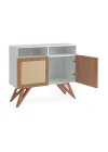 Fabricado em MDF BP 15mm revestido com melamina de alta resistência. Pés e detalhes em madeira maciça com acabamento em stain não verniz. Porta com aplicação de rattan natural. Entregue desmontado e embalado em caixa de papelão. Peso: 23kg. Capacidade suportada: 25kg.