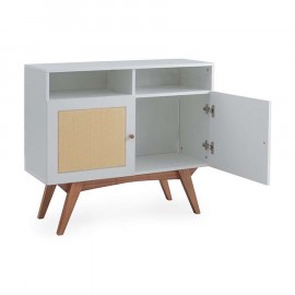 Fabricado em MDF BP 15mm revestido com melamina de alta resistência. Pés e detalhes em madeira maciça (taeda) com acabamento em stain não verniz. Porta com aplicação de rattan natural. Entregue desmontado e embalado em caixa de papelão. Peso: 26kg. Capacidade suportada: 30kg.