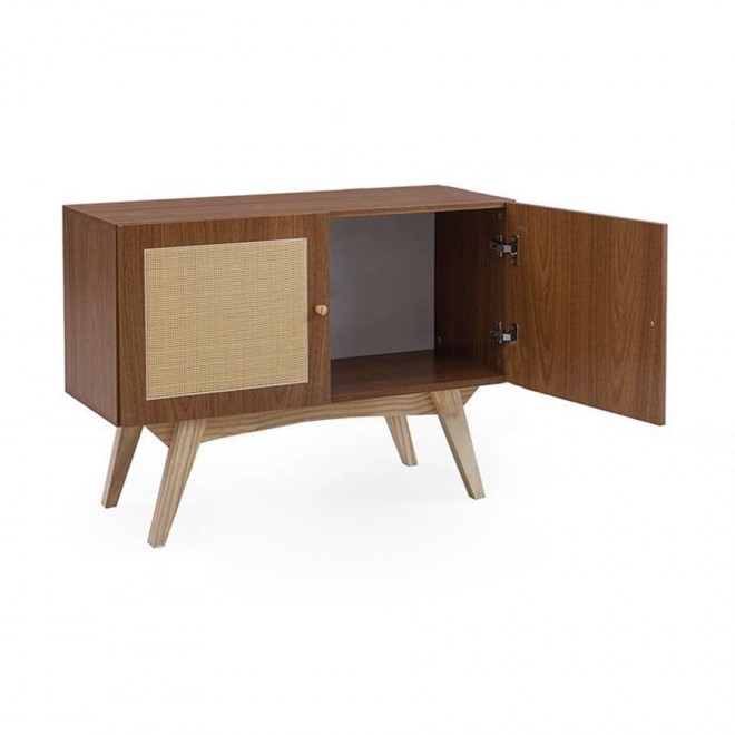 Fabricado em MDF BP 15mm revestido com melamina de alta resistência. Pés e detalhes em madeira maciça (taeda) com acabamento em stain não verniz. Porta com aplicação de rattan natural. Entregue desmontado e embalado em caixa de papelão. Peso: 21kg. Capacidade suportada: 25kg.