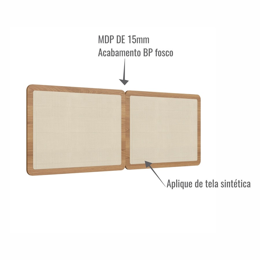 Produto entregue desmontado. Acompanha manual de montagem. Fixação é feita por parafusos, possibilitando a desmontagem do produto sem danificá-lo. Garantia de 3 Meses (contra defeito de fabricação). Escala de Brilho: Fosco. MDP 15mm com acabamento BP. Aplique de Tela Sintética (PVC com poliéster). Cantos arredondados. Fácil instalação com suporte metálico embutido no painel e parafusado na parede, não deixando folga entre painel e parede. Atende aos padrões Casal e Queen Size.