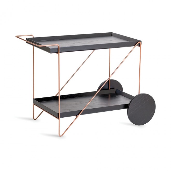 Estrutura em aço carbono pintado epoxi cor cobre, tampos em mdf laminado cinamomo tingidos em preto ebanizado. Capacidade suportada: 30kg. Peso: 22,45kg. Dimensão do tampo superior e inferior: Largura 89,5cm x Profundidade 51cm x Altura 5cm. Diâmetro da roda: 30cm. Distancia entre tampo superior e alça de mão: 9cm. Altura chão ao tampo inferior: 17cm. Distancia entre tampo superior e tampo inferior: 51cm. Profundidade total alça de mão até roda: 114cm.