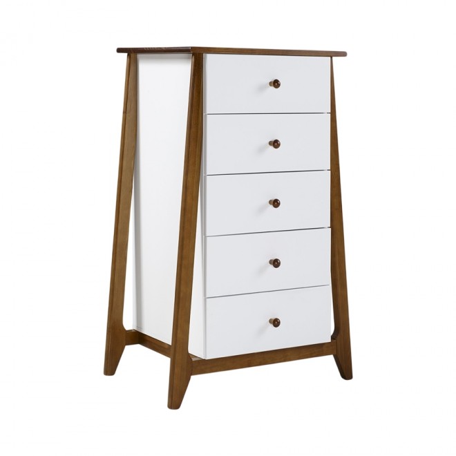 Produto entregue desmontado. Estrutura externa em madeira maciça de fonte renovável e acabamento em verniz natural. Estrutura interna e gavetas em MDF com acabamento em pintura laca fosca de alta qualidade. Gavetas com corrediças telescópicas.