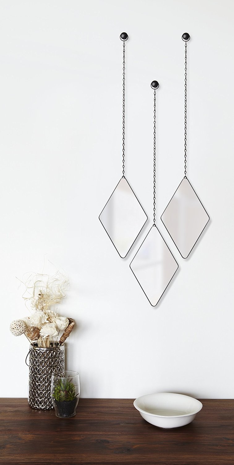 O trio de espelhos Dima tem inspiração na estampa de losangos escoceses, chamada de Argyle, que é muito presente em suéters e pullovers de inverno. Eles podem ser usados em conjunto ou individualmente, criando uma decoração geométrica em sua parede, além de poderem ser arranjados em uma orientação linear ou escalonados/em zig zag. Cada espelho mede 28,7 cm x 17,7 cm x 1,6 cm e sua corrente possui 38,1 cm. Fabricado em metal e vidro.
