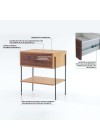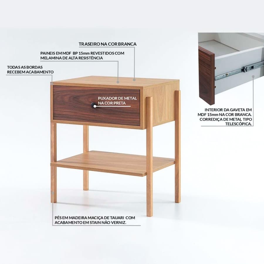 Construído em MDF bp 15 mm. Gaveta na cor pau ferro, com corrediça metálica tipo telescópica. Puxador em metal zamac. Produto entregue desmontado, embalado em caixa de papelão onda dupla. Acompanha manual de montagem. Este móvel não utiliza painel aglomerado nem MDP. Peso do produto: 8 kg. Capacidade suportada de até 10 kg. Pés em: Madeira Tauari (acabamento em stain não verniz), Madeira Imbuia (acabamento em stain não verniz) ou Metal (pés em aço carbono com pintura epóxi). As mesas confeccionadas com pés em madeira Tauari e Imbuia seguem as medidas C: 54 cm | A: 60 cm | L: 37 cm. Já a mesa com pés em metal, segue a medida C: 52 cm | A: 60 cm | L: 37 cm.