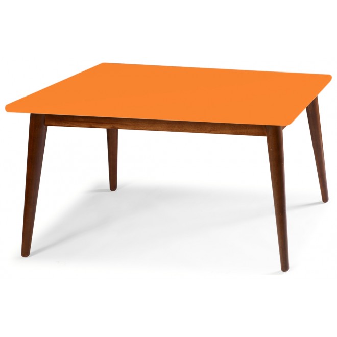 Estrutura feita de madeira maciça proveniente de reflorestamento (Tauari) e tampo da mesa em MDF com acabamento em laca. O produto é entregue parcialmente montado, apenas necessitando o encaixe dos pés. Sua capacidade suportada é de 55kg.