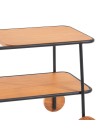 Mesa Lateral com duas rodinhas e duas prateleiras de madeira na cor mel. Estrutura em aço pintado na cor preta. Peso: 5kg. Capacidade suportada: 15kg. Produto entregue montado.