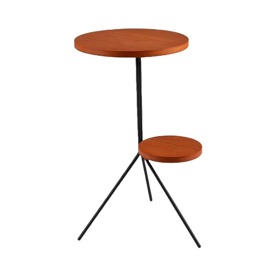 Mesa lateral com 2 tampos em madeira Eucalipto com base em aço carbono pintado na cor preta. Peso: 3kg. Capacidade suportada: 10kg. Produto entregue montado.