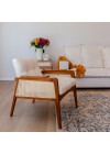 A Poltrona Aracaju é feita com madeira maciça e acabamento em verniz PU. O assento e encosto vão feitos em espuma densidade 28, extremamente confortável e revestida em tecido de linho. As laterais do assento possuem uma aplicação de tela portuguesa natural, detalhe que deixa a poltrona ainda mais elegante e charmosa. Os braços da cadeira ainda ganham no topo um desenho da madeira maciça levemente curvado, chamando mais atenção para as laterais e deixando o design mais moderno.