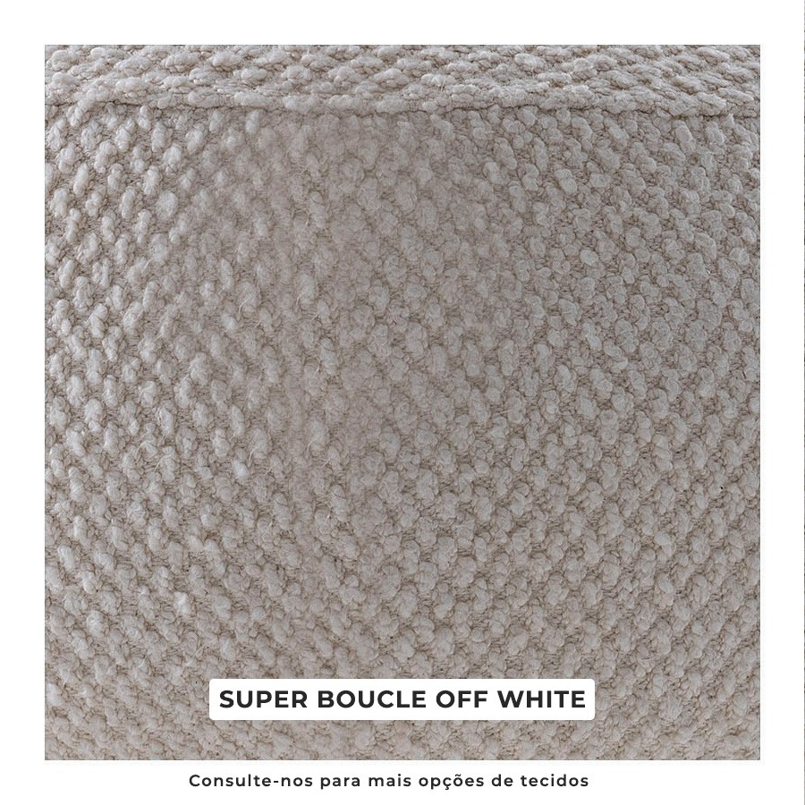 Produto entregue montado. Puff estofado com estrutura em madeira eucalipto, espuma do assento D28. Peso: 9 kg. Capacidade suportada: 120 kg. Garantia de 6 meses contra defeitos de fabricação.